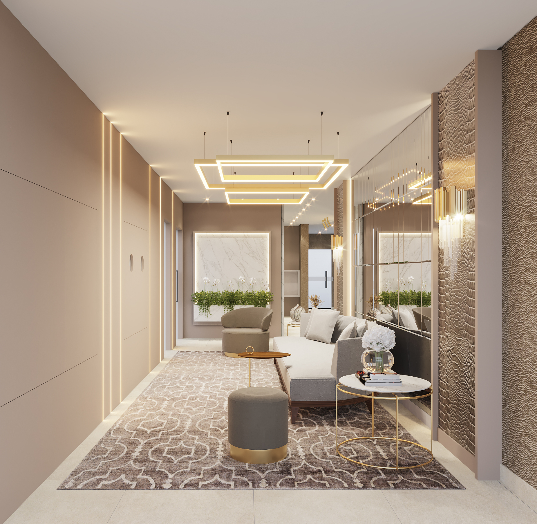 Hall projetado para proporcionar aos moradores do edifício e seus convidados um escape da correria do mundo lá fora e uma linda transição até cada apartamento.