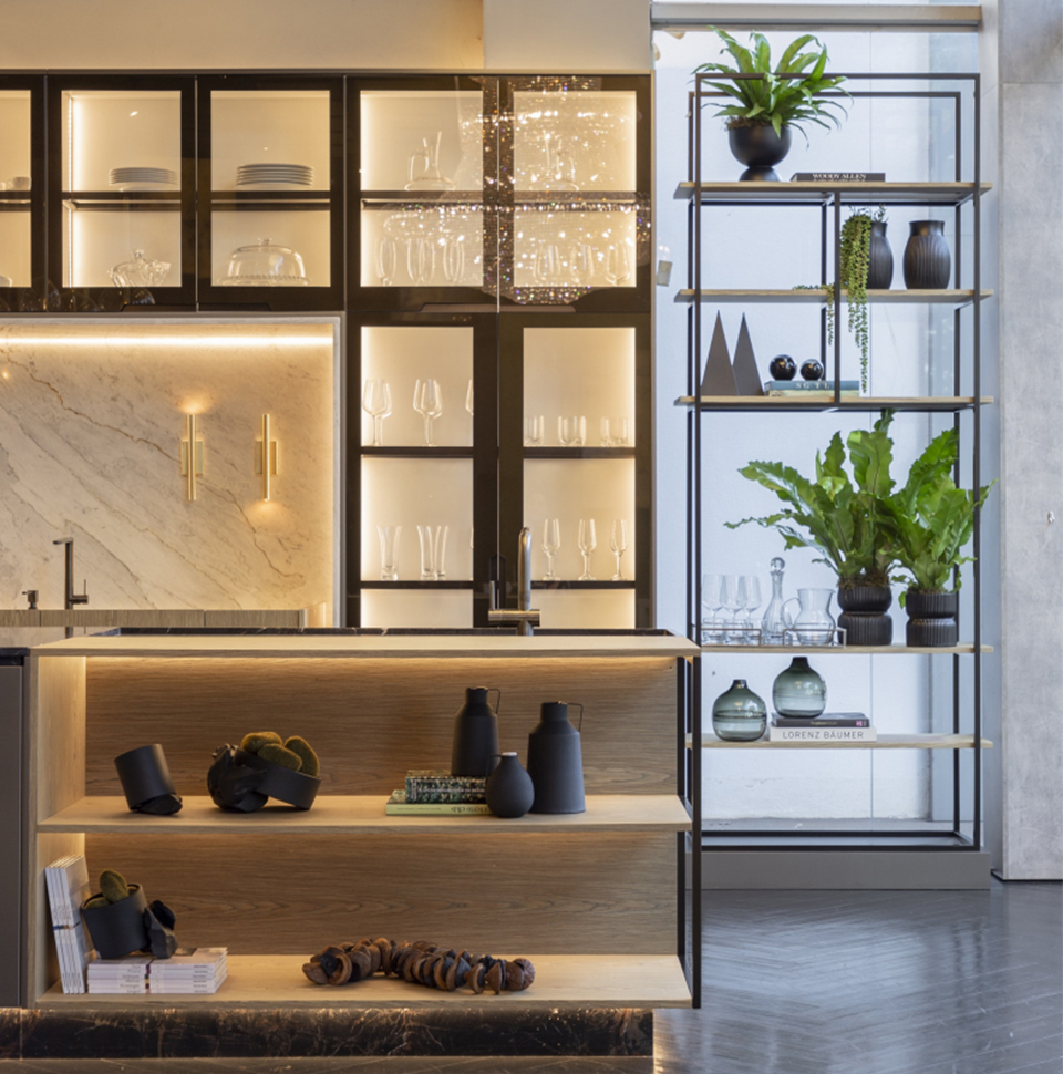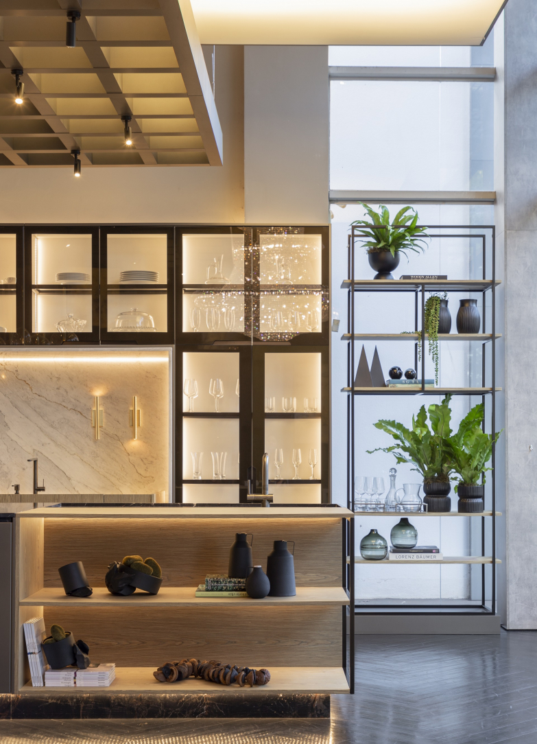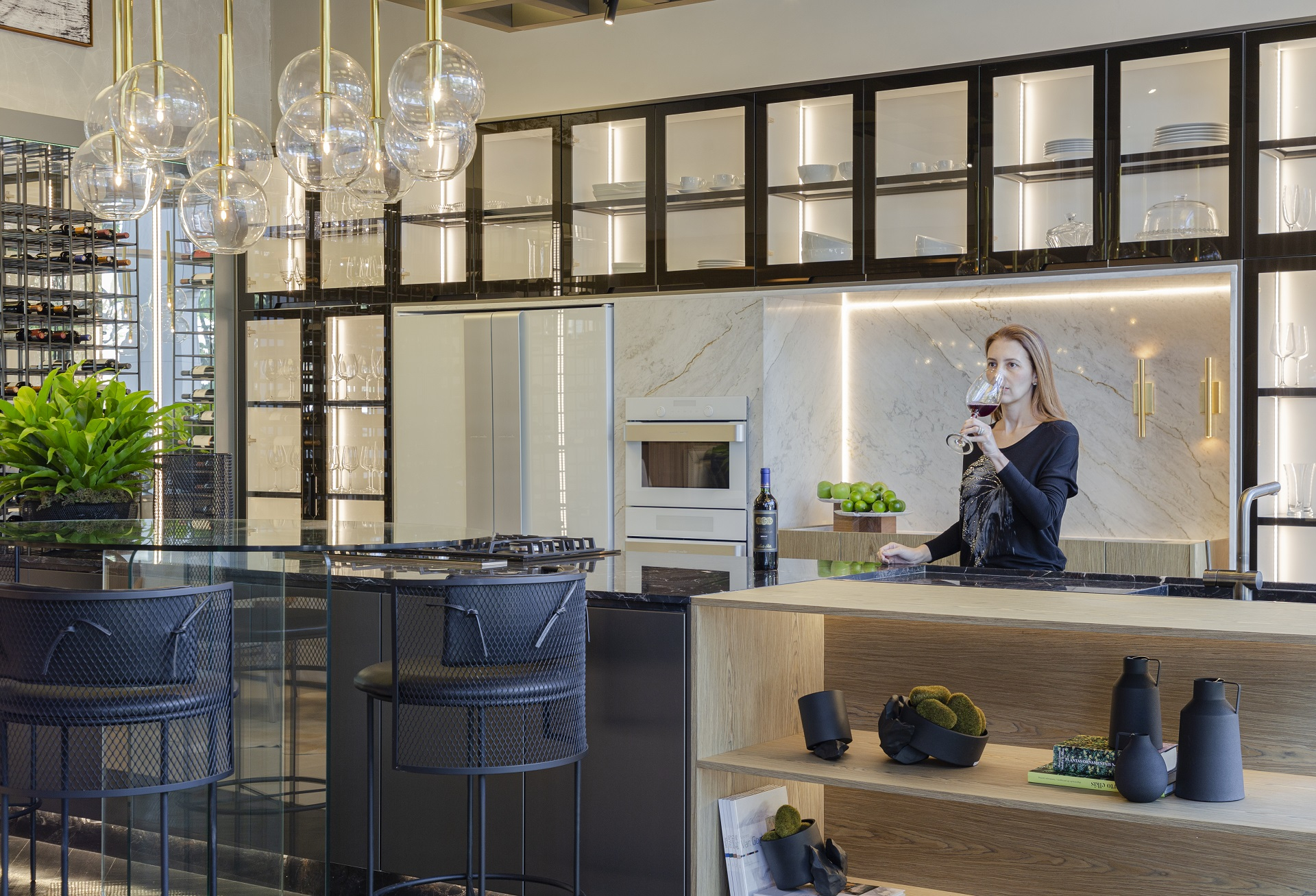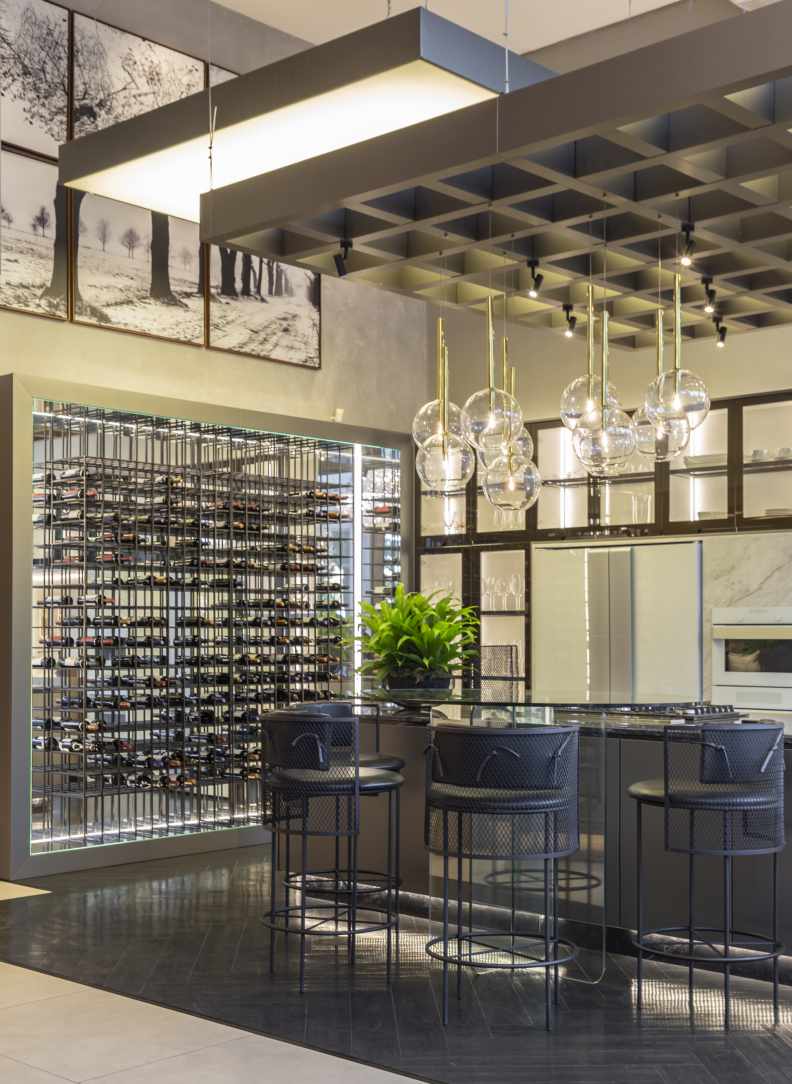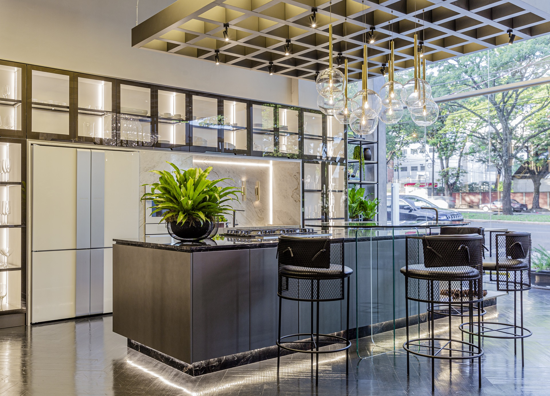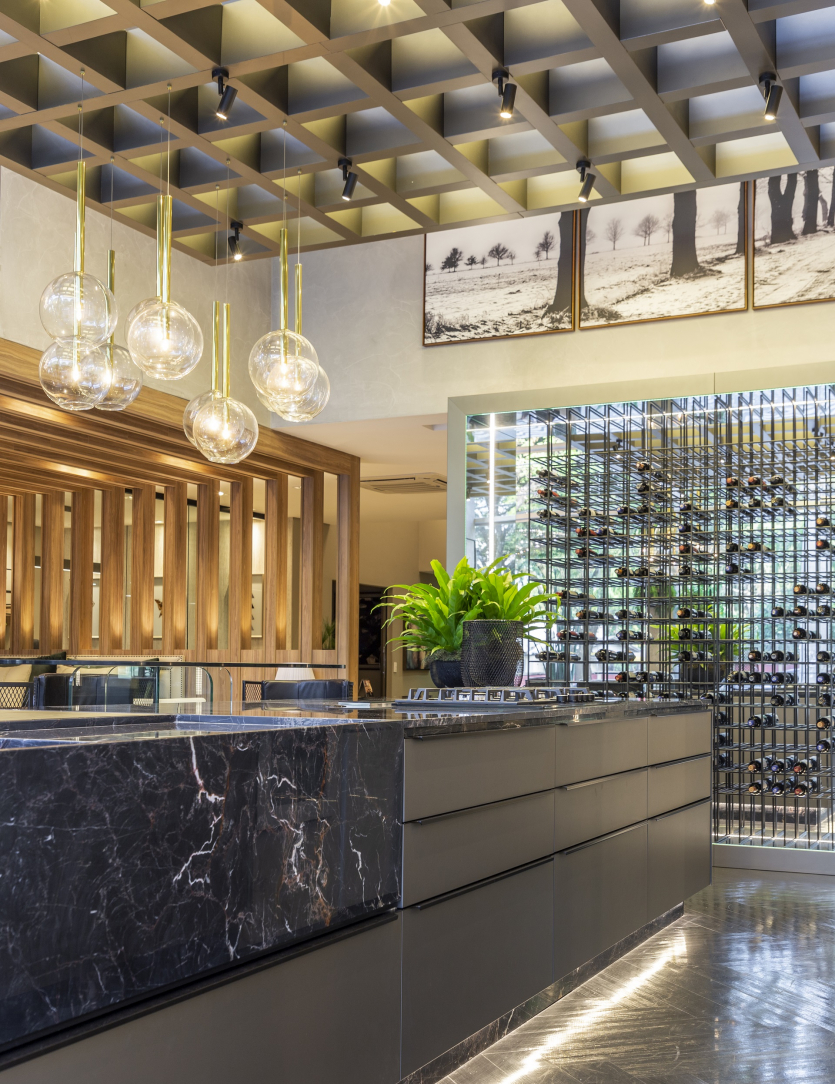 Uma cozinha gourmet com tudo o que há de mais lindo: louceiros iluminados, mármores nobres, eletros super contemporâneos, iluminação pra lá de especial com esses forros lindos totalmente executados pela loja. Para adega, foi projetada uma caixa internamente espelhada, com espaço suficiente para alojar até 300 garrafas suspensas por uma estrutura metálica bem fininha...Um conjunto de elementos pensado pra receber os clientes com toda a expertise Idélli.