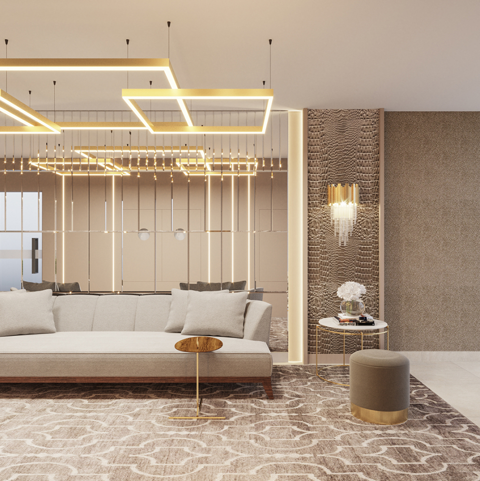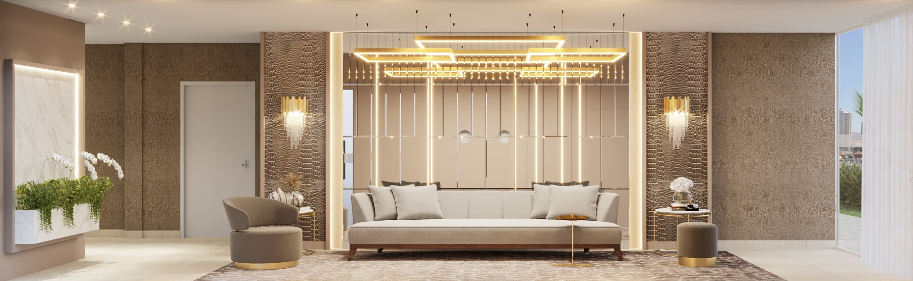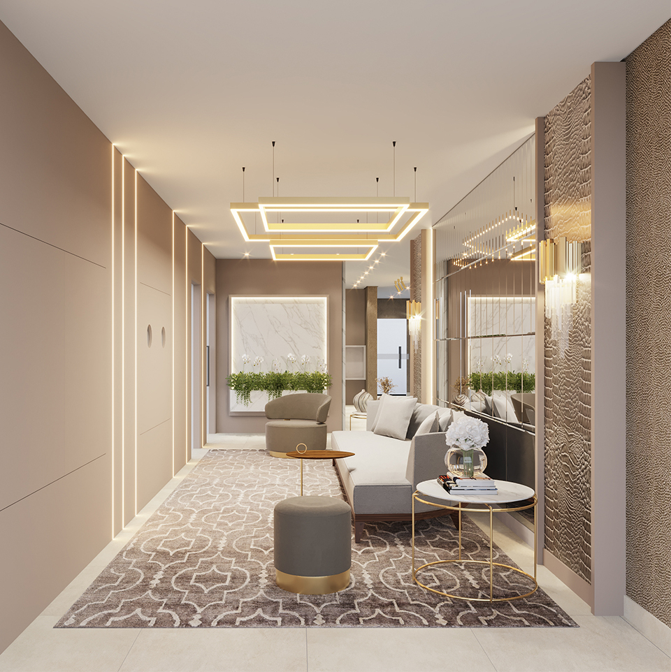 Hall projetado para proporcionar aos moradores do edifício e seus convidados um escape da correria do mundo lá fora e uma linda transição até cada apartamento.